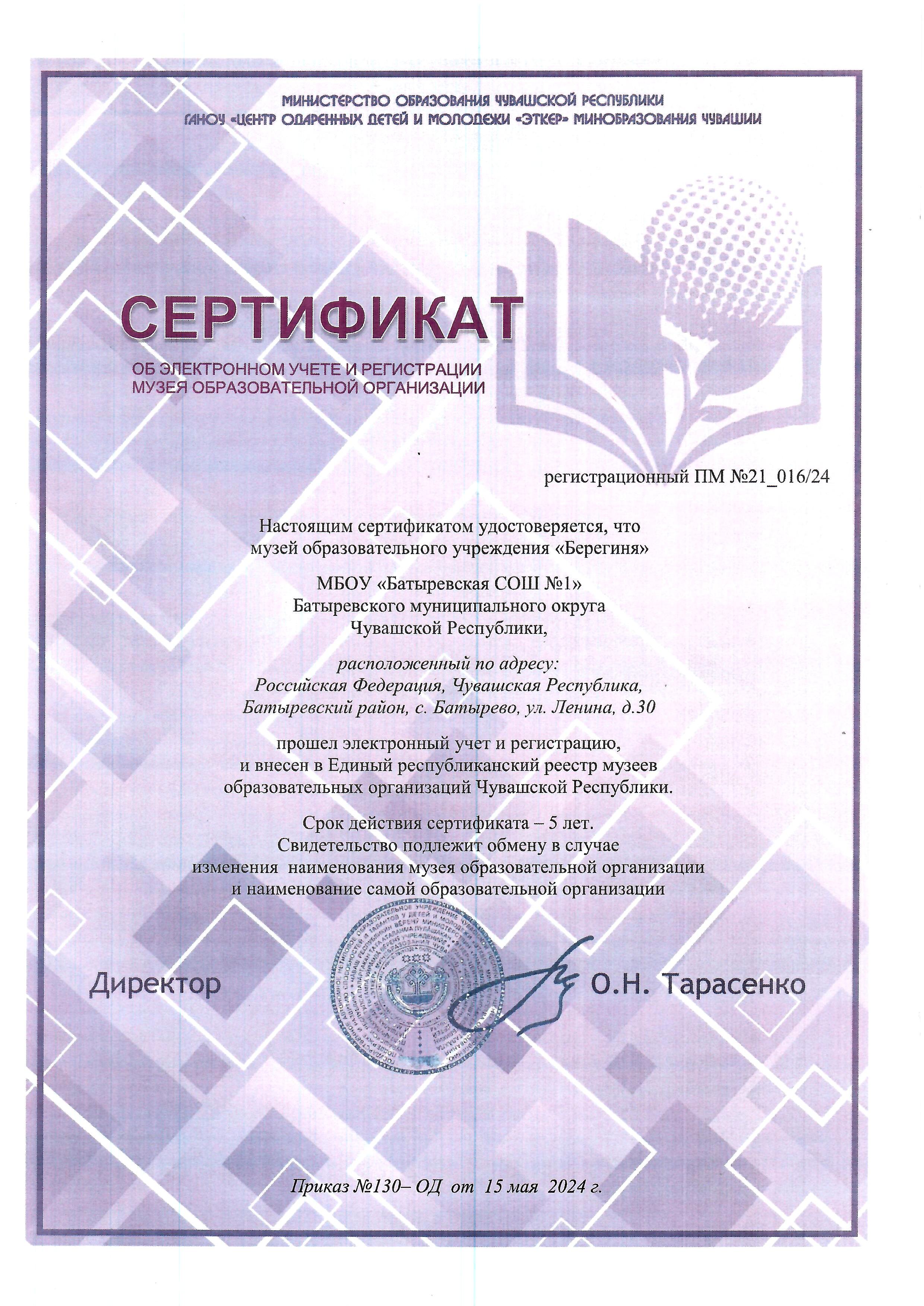 Сертификат об электронном учете и регистрации музея образовательной организации