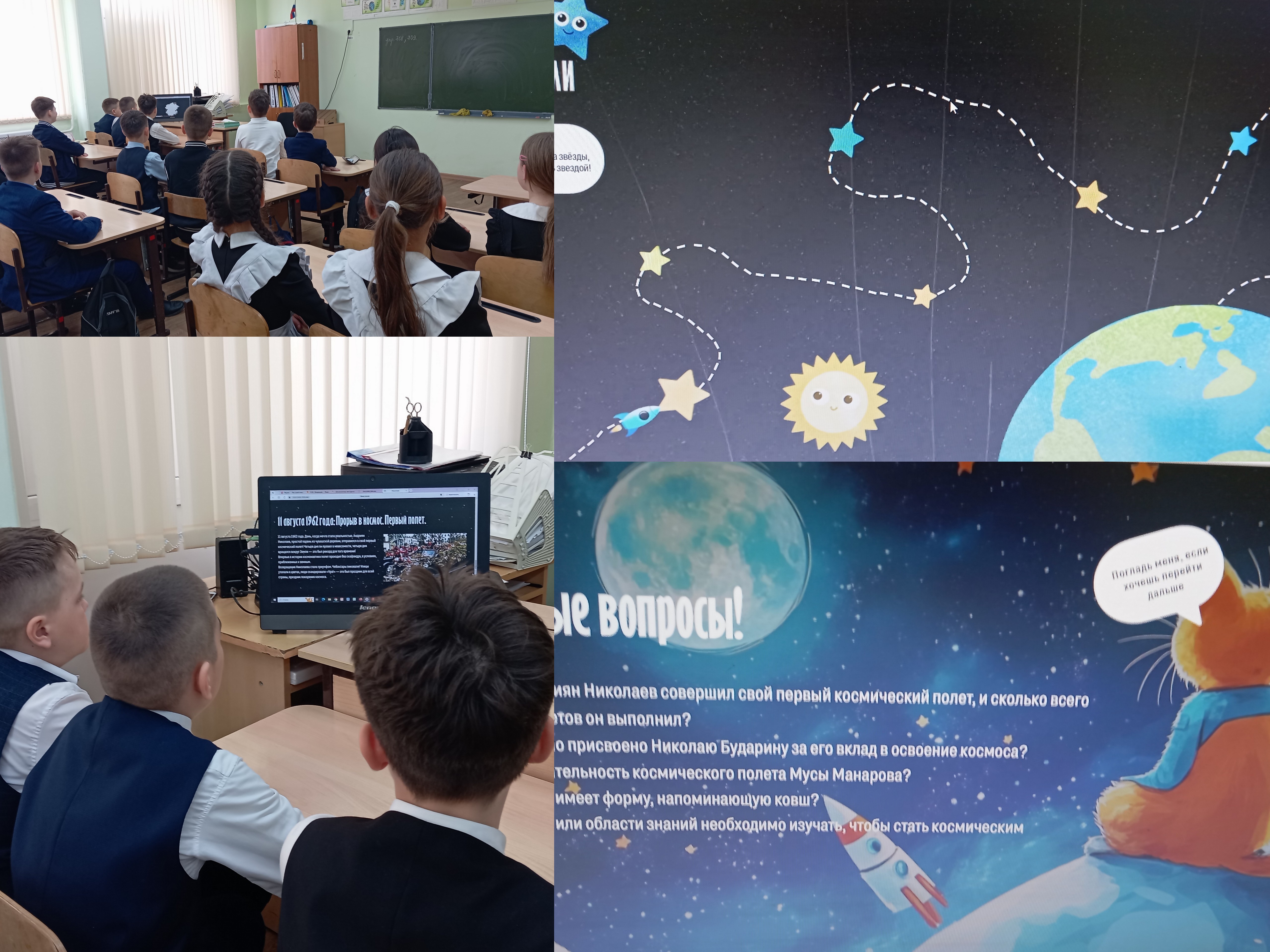 Классный руководитель познакомила учащихся с достижениями отечественной космонавтики, вкладом чувашского народа в освоение космического пространства. Пользуясь интерактивной картой «Твои звезды над Шоршелами», школьники познакомились с биографией и космическими рекордами первого чувашского космонавта А.Г. Николаева, услышали рассказ о выдающихся космонавтах нашей Родины Бударине Н.М., Манарове М.Х. Используя онлайн-ресурс, учащиеся смогли увидеть места, связанные с жизнью и деятельностью А.Г. Николаева, а также узнали интересные факты о развитии космической отрасли в Чувашии.