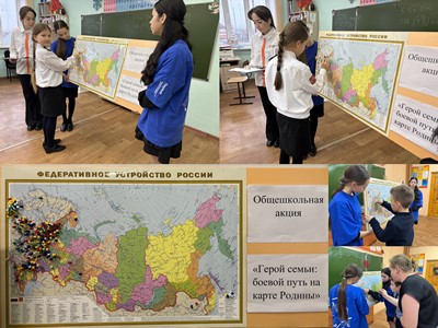 В назначенный день ученики подходили к волонтерам и с их помощью флажками обозначали боевой путь героя семьи на карте России.